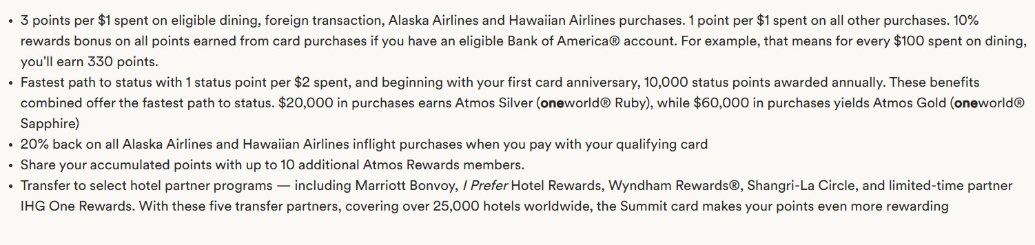 A pesar de su anualidad relativamente alta de $395, la Atmos™ Rewards Summit Visa Infinite® ofrece una serie de beneficios que la hacen una opción ideal entre tarjetas de crédito para viajeros frecuentes. La habilidad de poder ganar 3X puntos por dólar en compras extranjeras la hacen una opción ideal para viajes internacionales. El companion award de 25,000 puntos otorgado anualmente hacen que la tarjeta sea una que mantengas aún después del primer año. Y la oportunidad de redimir los puntos para awards con American Airlines y otros partners hacen casi irrelevantes el hecho de que nunca vueles Alaska Airlines a la hora de considerar esta tarjeta.