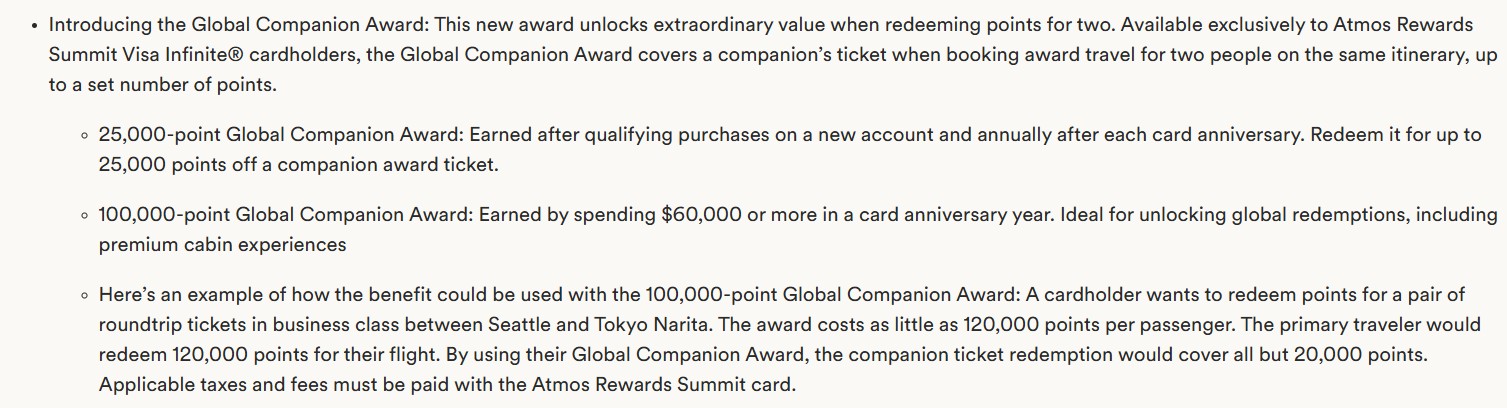 Por otro lado, Siempre y cuando puedas utilizar el companion award, el valor real del bono de bienvenida es de sobre 100,000 puntos. El companion award puede ser utilizado para cualquier award Atmos, incluyendo partners. El único requisito es que tienen que haber al menos dos pasajeros en la reserva para poder utilizarlo. Y si el precio del award sobrepasa los 25,000 puntos, puedas pagar la diferencia en puntos del programa.