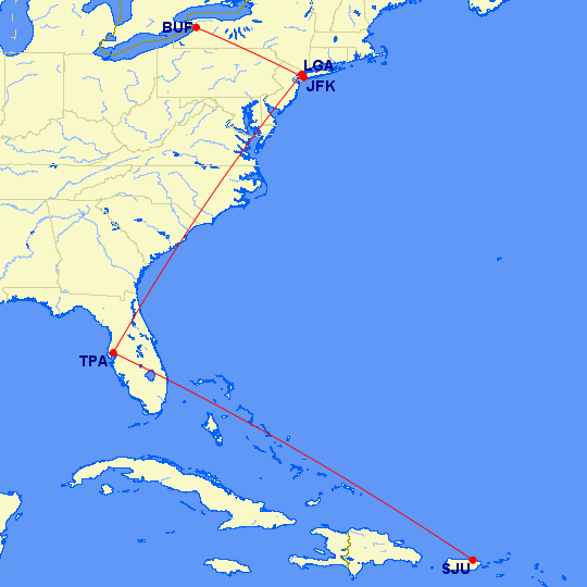 Pude haber pasado la noche en BUF, pero eso habría significado un vuelo de regreso a las 6 a.m., así que opté por regresar a JFK esa misma noche en el mismo avión. Por eso fue que terminé haciendo cuatro vuelos en un día, algo que inicialmente estaba evadiendo mientras construía mi itinerario para el Challenge.