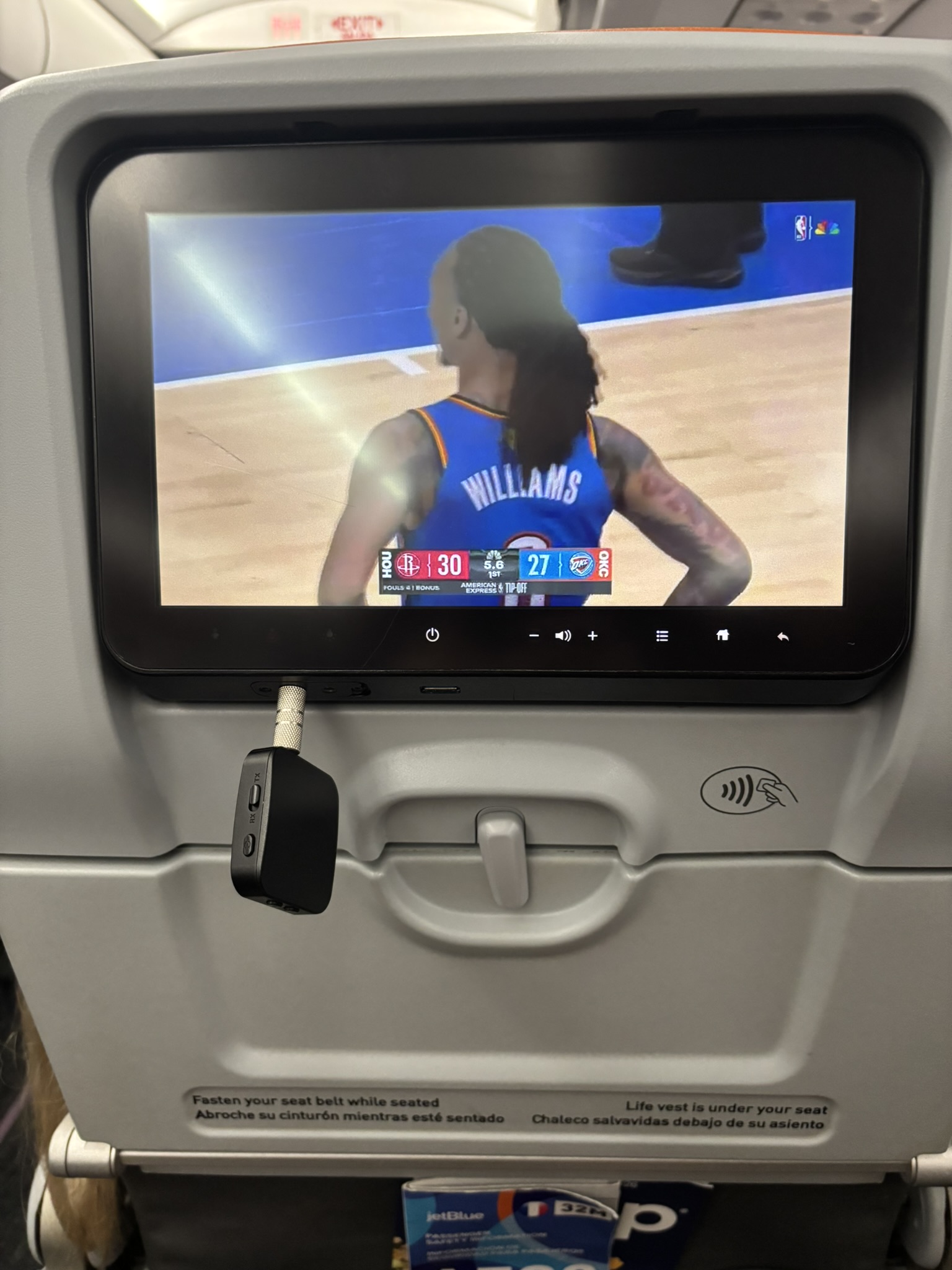 Al finalizar la película, mientras nos acercábamos a EWR, los canales de televisión estaban disponibles, así que aproveché para ver parte del primer juego de la temporada de la NBA entre Houston y Oklahoma City.