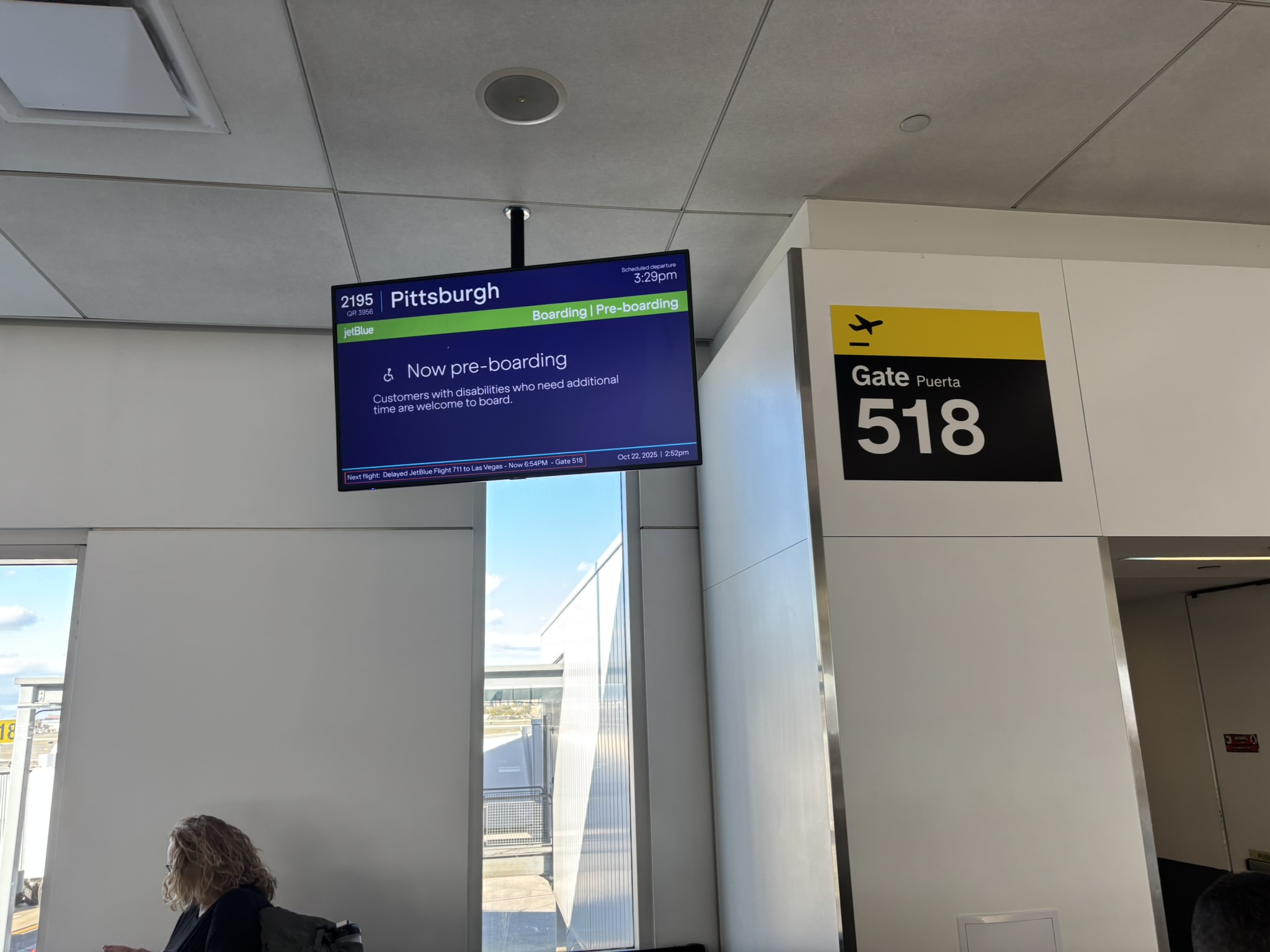 Al igual que el día anterior en SJU, en JFK todo parecía operar con normalidad a pesar del cierre del gobierno federal. Y, nuevamente, llegué a mi gate justo cuando comenzaron a llamar a los pasajeros Mosaic para abordar el vuelo hacia Pittsburgh International Airport (PIT), mi destino número 20 del JetBlue 25 for 25 Challenge.