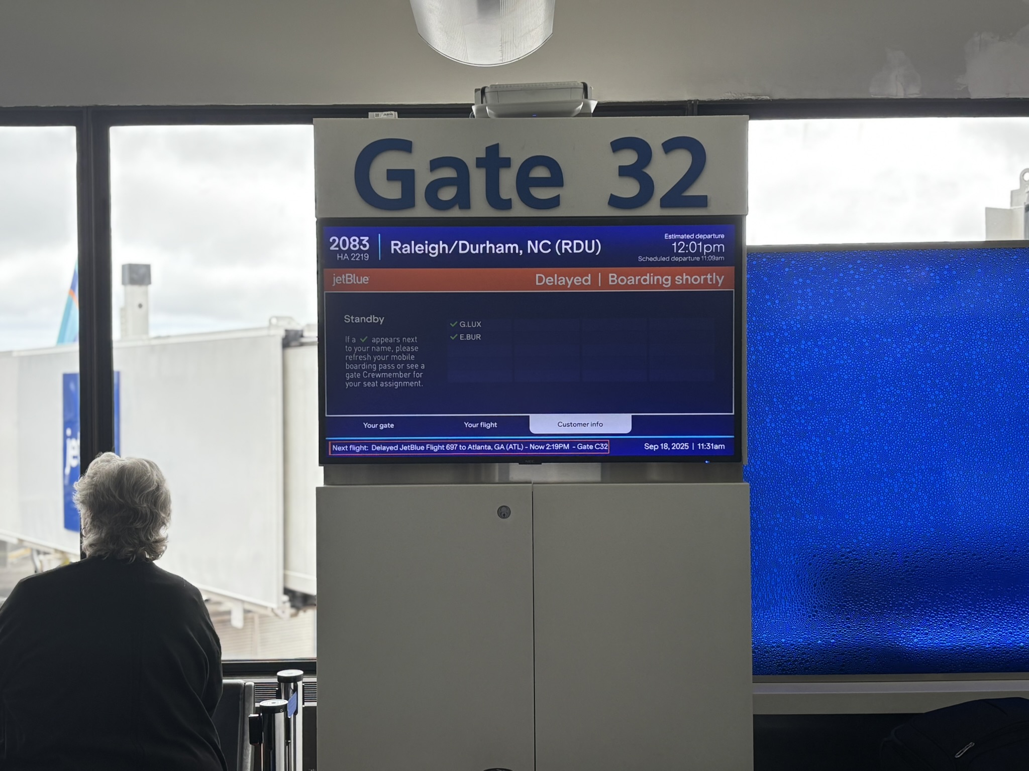 Cuando finalmente llegué al gate en Boston (BOS), noté una coincidencia curiosa: el vuelo del gate contiguo era de un vuelo de JetBlue hacia SJU. Lo mismo me había ocurrido dos semanas antes en FLL, cuando el gate al lado del gate de mi vuelo hacia MDE era de un vuelo a SJU. Es como si hubiera sido una broma del destino.