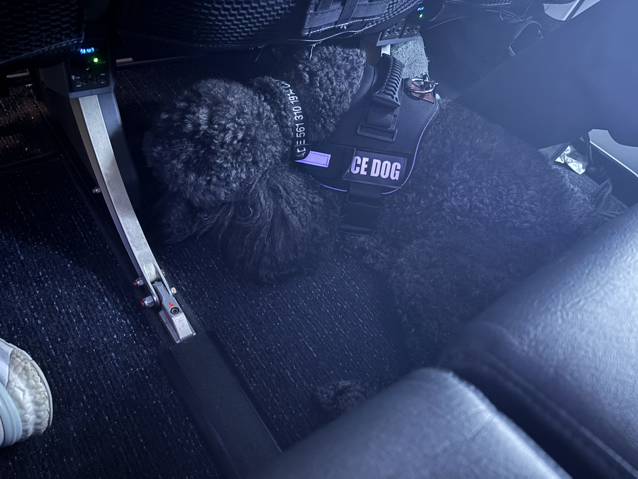 El vuelo a PBI salió y llegó antes de tiempo, con una duración de dos horas y cincuenta minutos. Pude seleccionar un asiento EvenMore de pasillo, y tuve el seatmate más interesante de todo el Challenge: un Poodle negro “de servicio”.